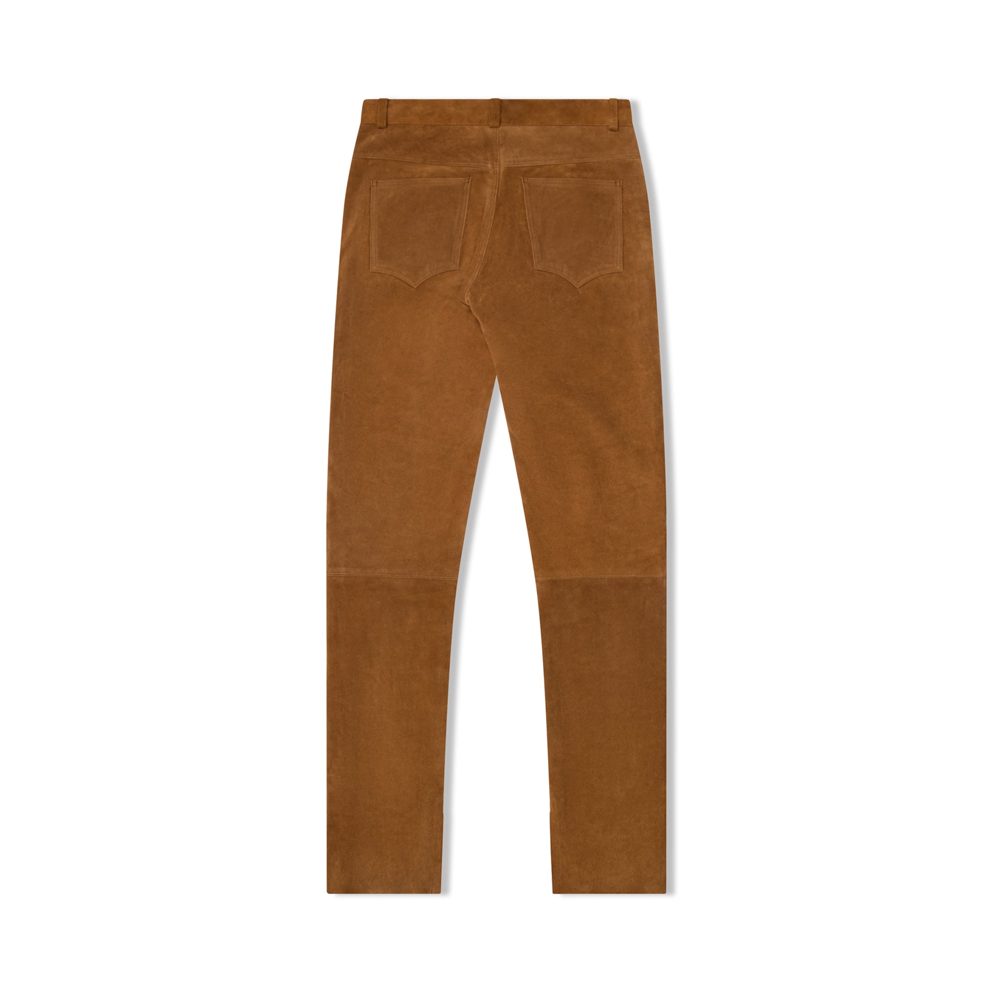 Crafted from 100% genuine suede and lined with 100% silk, these trousers feature a straight fit silhouette with structured panel seams and a distinctive asymmetrical wrap waistband with dual-button closure.